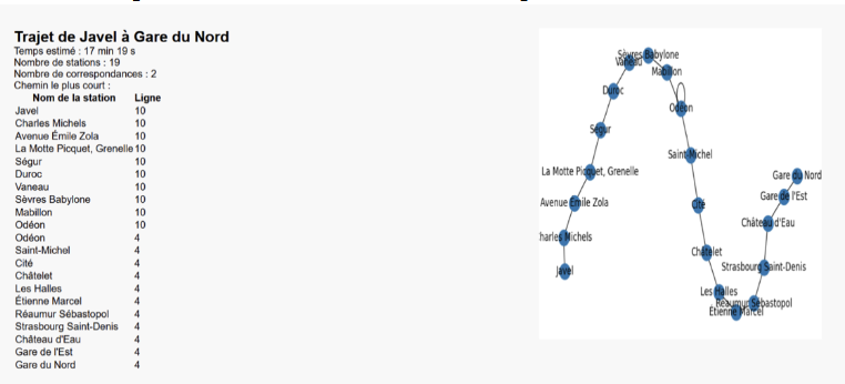 Le projet RATP permet d'effectuer une recherche en trouvant l’itinéraire le plus optimal possible (en minimisant le nombre de stations à parcourir), tout en prenant en compte les correspondances et les différentes lignes de métro. Pour cela, nous avons utilisé l'algorithme de Bellman-Ford pour effectuer les calculs. L'application permet également d'afficher les différentes lignes de métro sur une carte et de comparer les trajets entre deux stations.