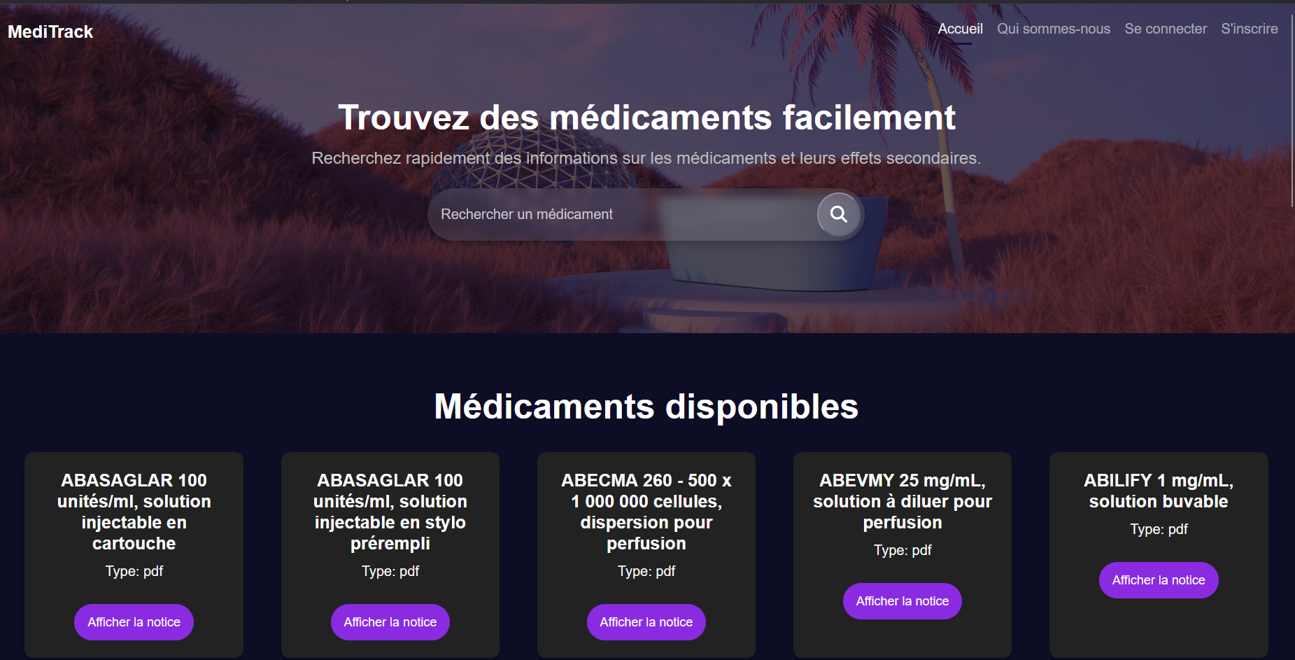 MediTrack est une application permettant d’obtenir plus facilement des informations médicales à partir des notices brutes de médicaments. Dans un premier temps, j’ai développé un script de scraping afin de récupérer les notices auprès de l’ANSM, puis j’ai extrait et structuré les informations essentielles de chaque médicament pour les stocker dans une base de données MongoDB, facilitant ainsi leur exploitation. J’ai également mis en place une base de données relationnelle Neo4j afin de relier les différentes informations entre elles et d’effectuer des requêtes complexes. Enfin, une interface web a été développée avec Flask afin de permettre aux utilisateurs de rechercher et d’afficher les informations médicales de manière conviviale.
